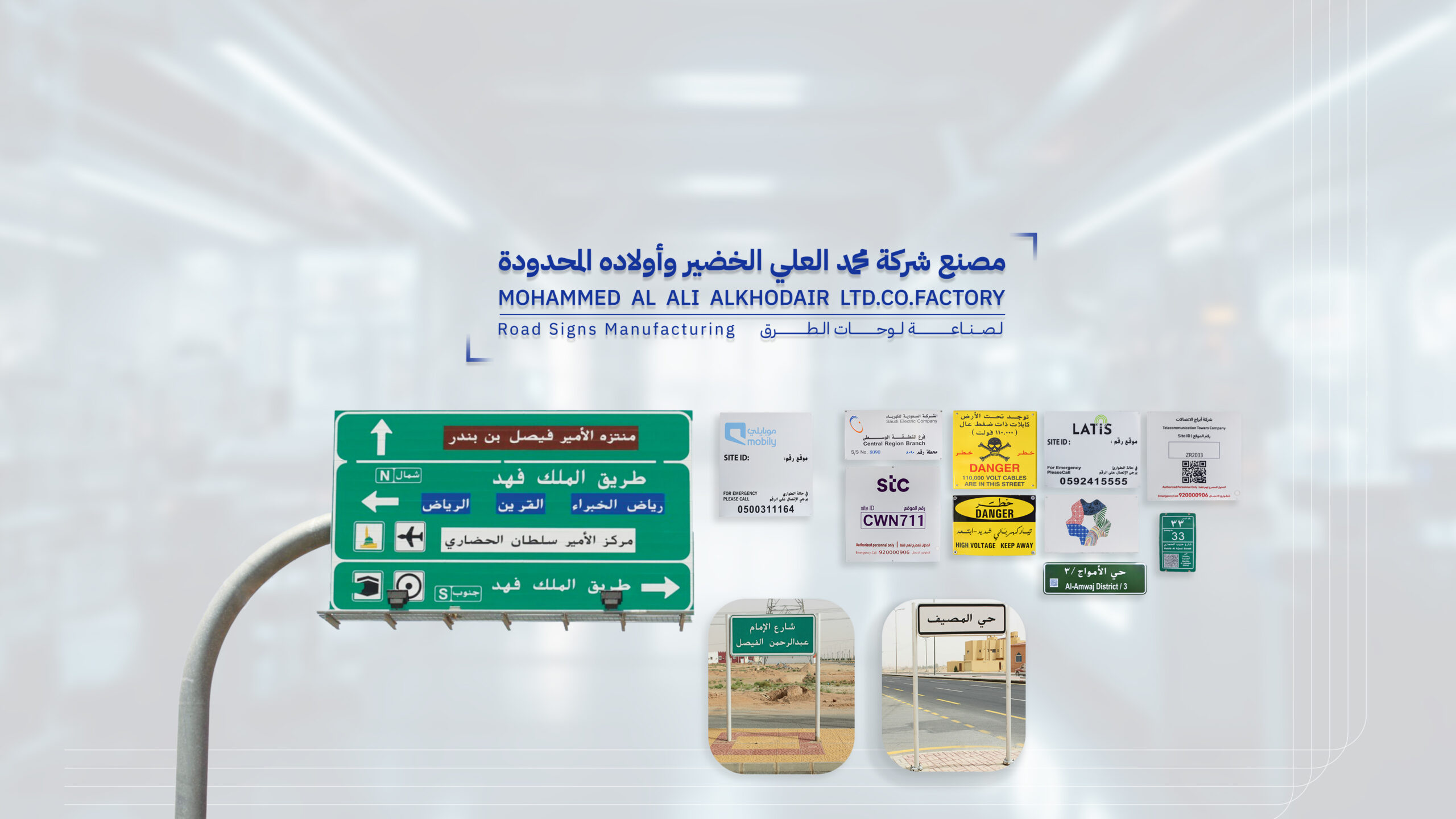 مصنع شركة محمد العلي الخضير وأولاده المحدودة لصناعة لوحات الطرق، والمرخص له من قبل وزارة الصناعة س/ت: 1010352322 والمعتمد من قبل وزارة النقل بخطاب رقم 01/54663 في تاريخ 23/10/1434 هـ، تعتبر شركة الخضير إحدى الشركات المتخصصة في تصميم وتصنيع وتركيب لوحات الطرق المختلفة والعلامات المرورية واللوحات الإرشادية العاكسة، وذلك بالتعاون مع كبرى الشركات الألمانية المتخصصة.